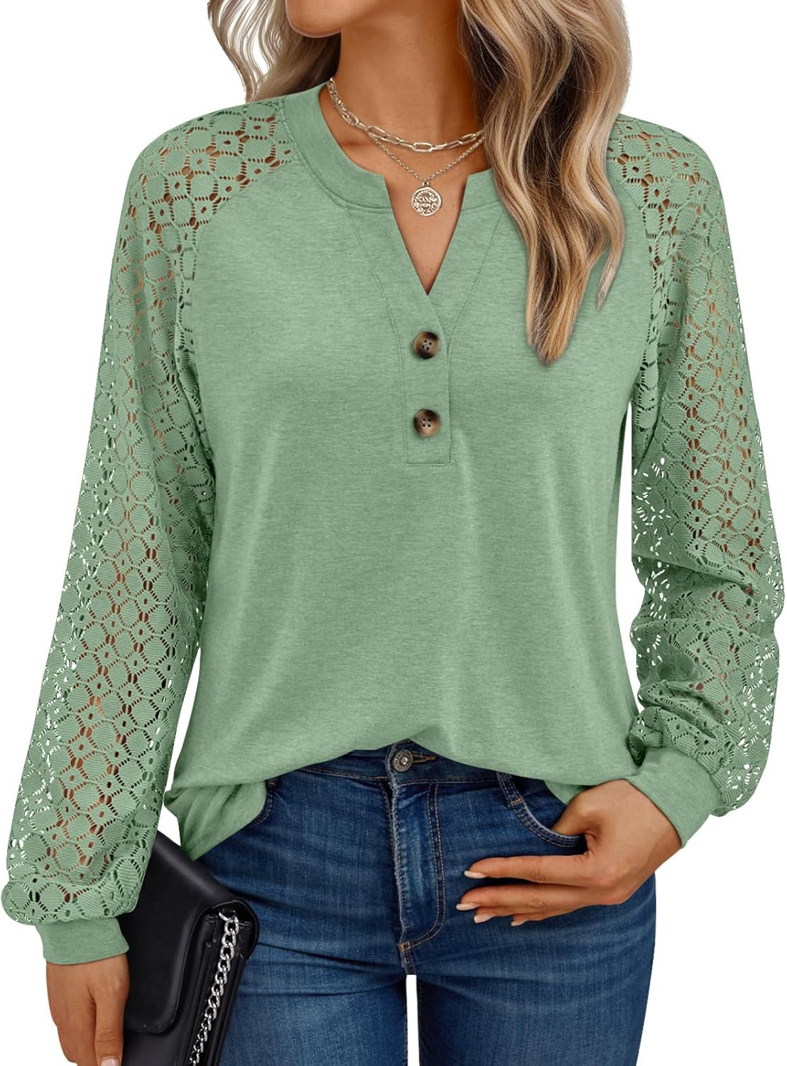 The lace long sleeves and V-neck henley design add a feminine, dressy touch that’s perfect for business casual settings or going out.